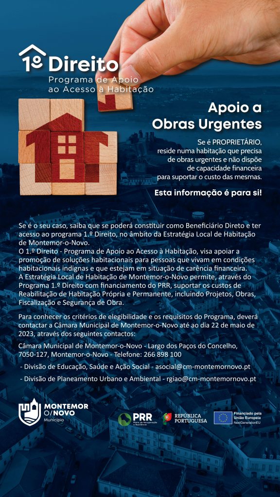 A Estratégia Local de Habitação de Montemor-o-Novo permite, através do Programa 1.º Direito, suportar os custos de Reabilitação de Habitação Própria e Permanente, na totalidade ou em parte, dependendo dos rendimentos do agregado, incluindo Projetos, Obras, Fiscalização e Segurança de Obra.